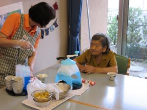 カキ氷に果物をトッピングして、いつもよりおいしそうなカキ氷に、皆様「美味しいわぁ。」と喜びながら、食べられました。