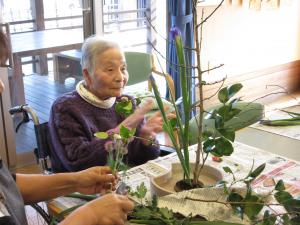 今回は、梅や椿などの花を中心に、季節感あふれる生け花が出来上がっています。