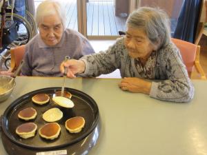 焼きあがったホットケーキに、生クリームやチョコレートソースをかけて、甘い香りと美味しいホットケーキを召上っていただきました。