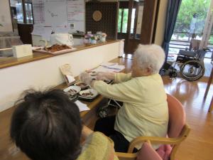 パンを油で揚げて、御利用者の方に砂糖をつけてもらっています。