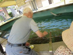 亀の水槽があり餌をあげているところです。