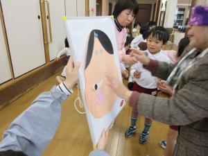 園児の方々と、けん玉・福笑い・こま回しといった昔の遊びを楽しみました。