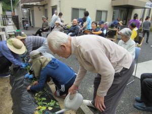 ほのぼの保育園の子どもたちと、近隣施設の方々と一緒にさつま芋の苗を植えました。