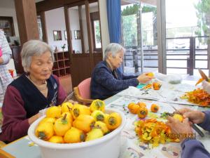 今日はたくさんいただいた渋柿で干し柿を作りました!皆さん手慣れた手つきで次々と柿を剥かれています。