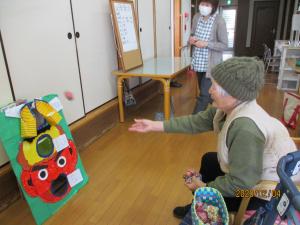 ゲームで鬼に見立てた的にお手玉を投げて得点を競いました!