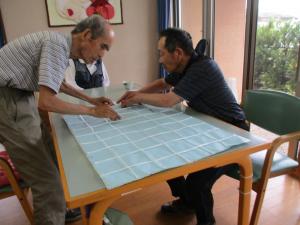 朝顔の蔦を這わすために、ビニールひもを使って模造紙にネットを作ってもらっています!