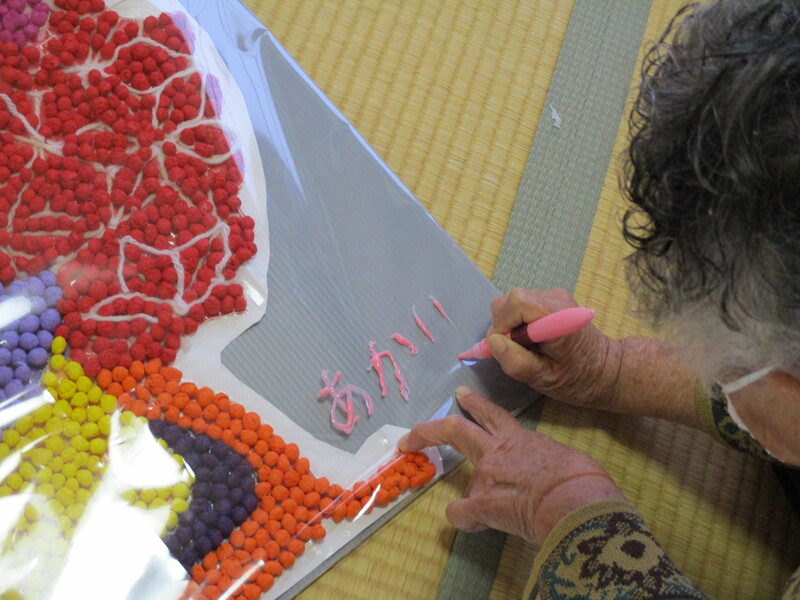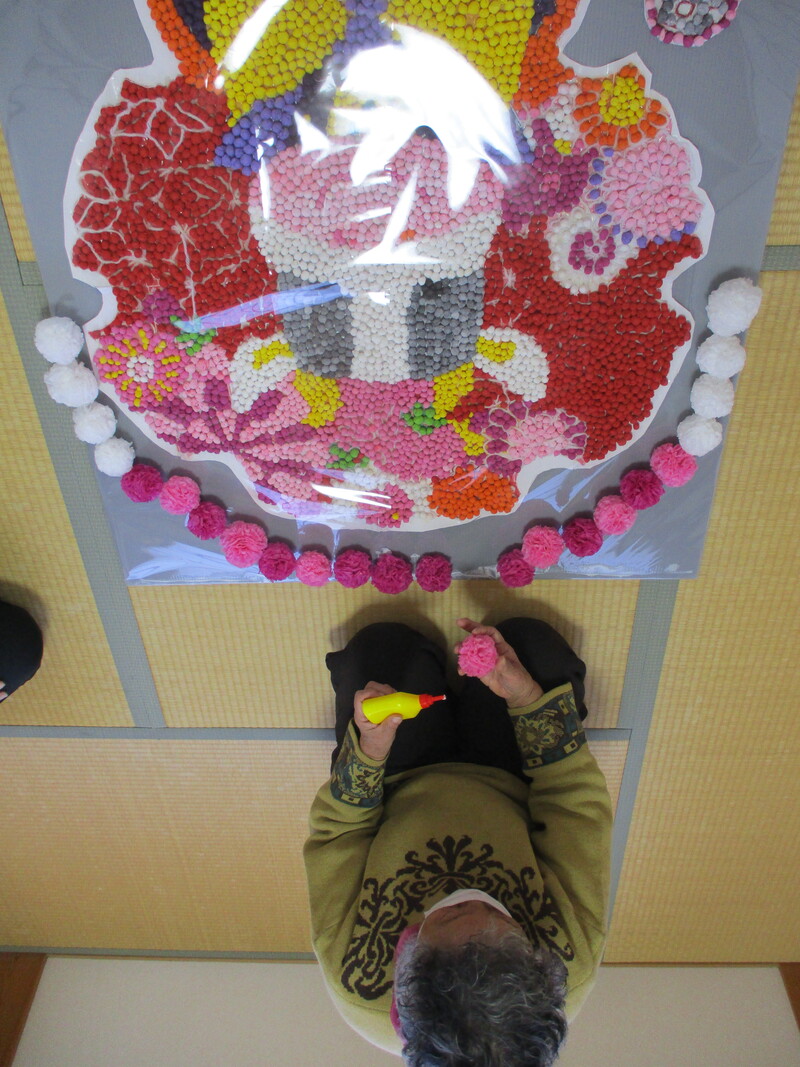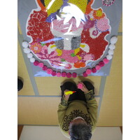 フィルムを張り保護し、その上からお花紙で作った花を張り付け枠を作りました!