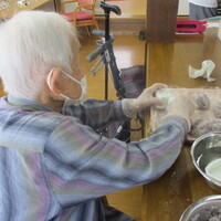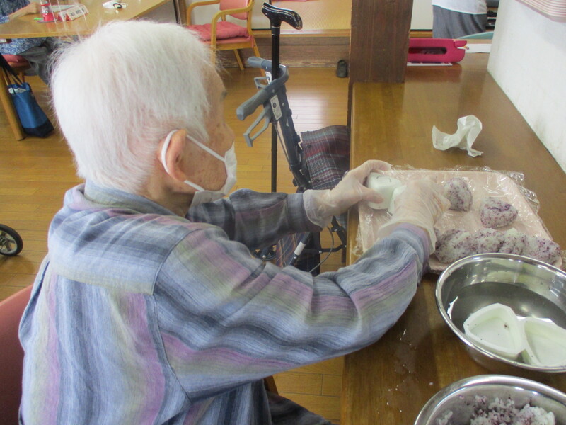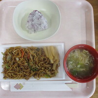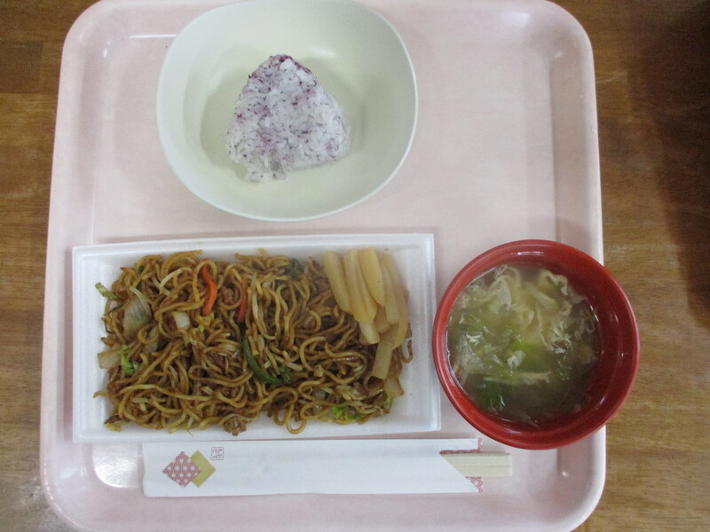 今月の食事作りのメニューは「焼きそば・ゆかりご飯のお握り・ジャガイモのきんぴら・卵スープ」おやつに「紫陽花ゼリー」を作りました(*^^*)