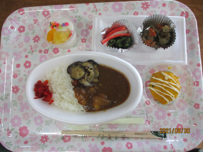 夏野菜カレーです。おやつは牛乳寒天になっています!