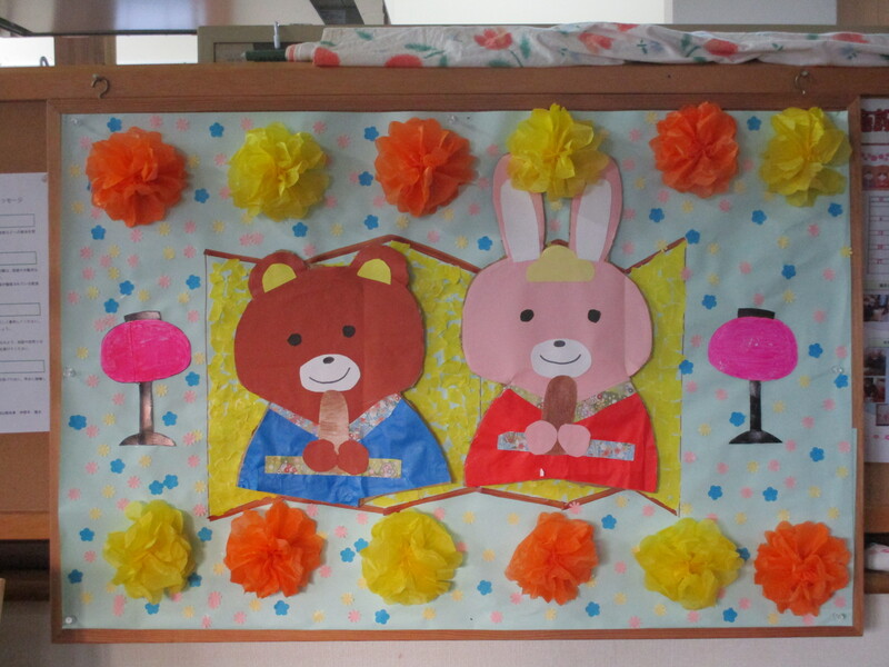 お雛様の壁面には小花がちりばめられていてとてもかわいらしい出来上がりとなっています。