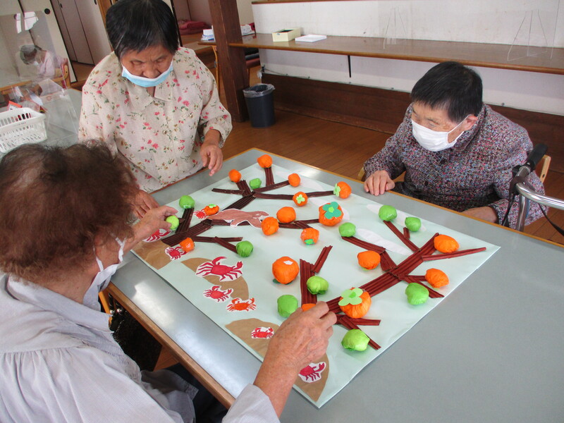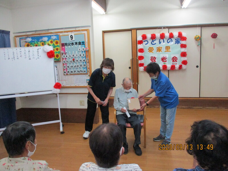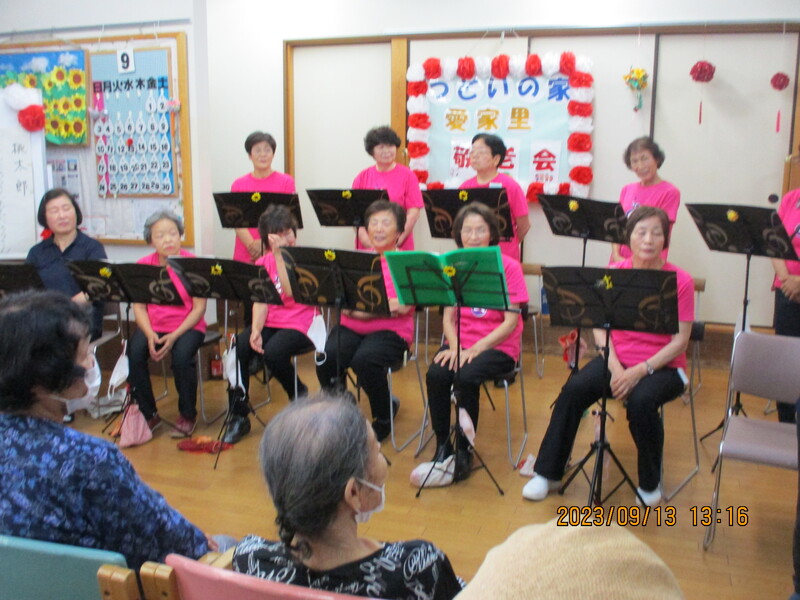 利用者の皆様に日頃の感謝をお伝えし、長寿を願い敬老会を開催しました。 昼食は職員と一緒に利用者の方も手伝って下さりお祝い膳を作りました。 午後からはオカリナ演奏のボランティアの皆様が来所して下さり馴染みの曲を演奏され、利用者の方もオカリナの素朴な音色に感激されていました。 卒寿の方のお祝いもさせて頂き皆様の笑顔をたくさん見る事が出来た一日となりました。
