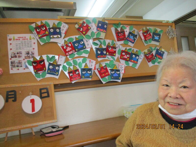2月に入り寒かったり、暖かかったり気温差がはげしい毎日ですが皆様お元気に愛家里に通ってきてくださっています。玄関では皆様手作りの鬼が出迎えてくれます。