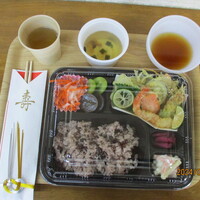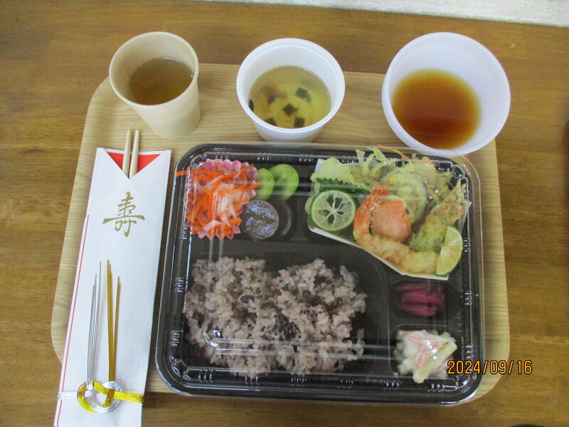 赤飯、天ぷら盛り合わせ、紅白なます、マカロニサラダ、フルーツにシャインマスカットとピオーネ!