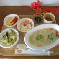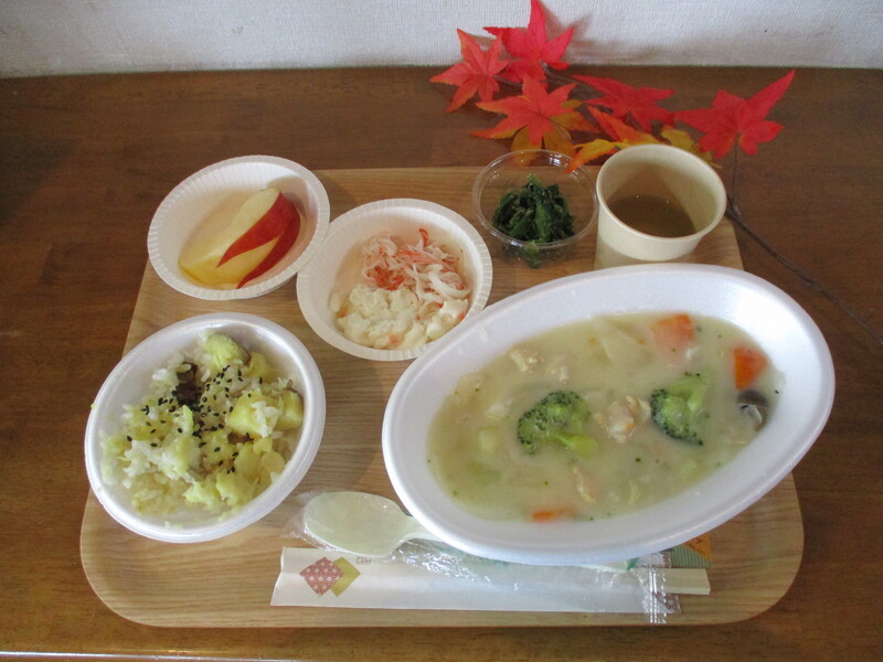 さつまいもごはん、クリームシチュー、ポテトサラダ、ほうれん草おひたし