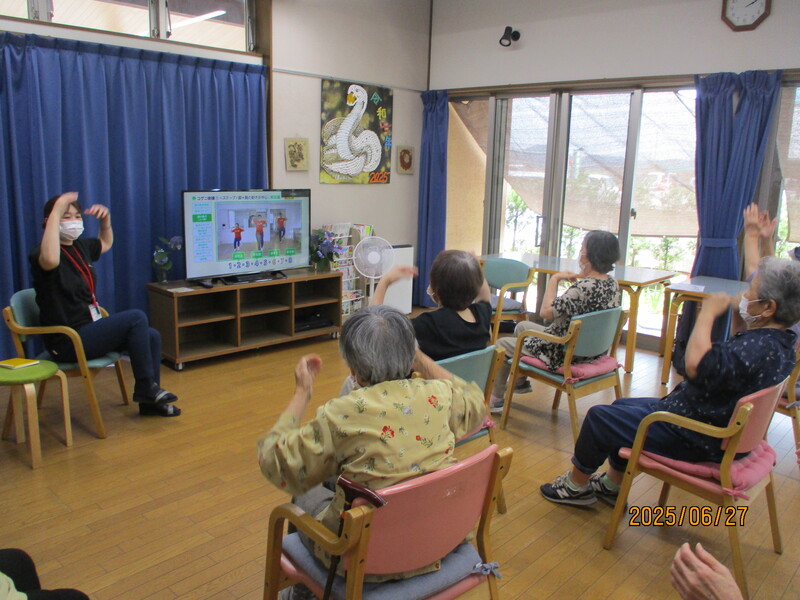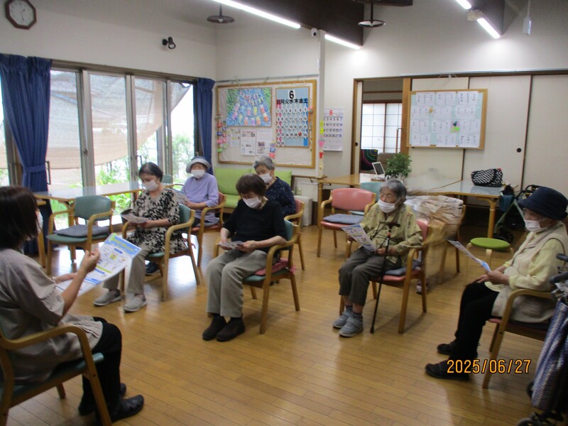愛家里カフェでは西部包括の職員の方に来ていただき、熱中症の話や物忘れにいい体操など様々なことをお話・実践していただきました!
