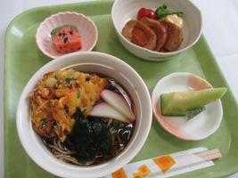 「かき揚げそば、ミートローフ、すいかのパウンドケーキ、メロン」