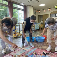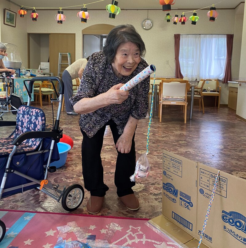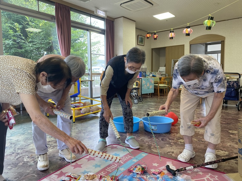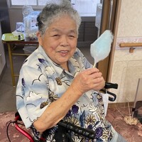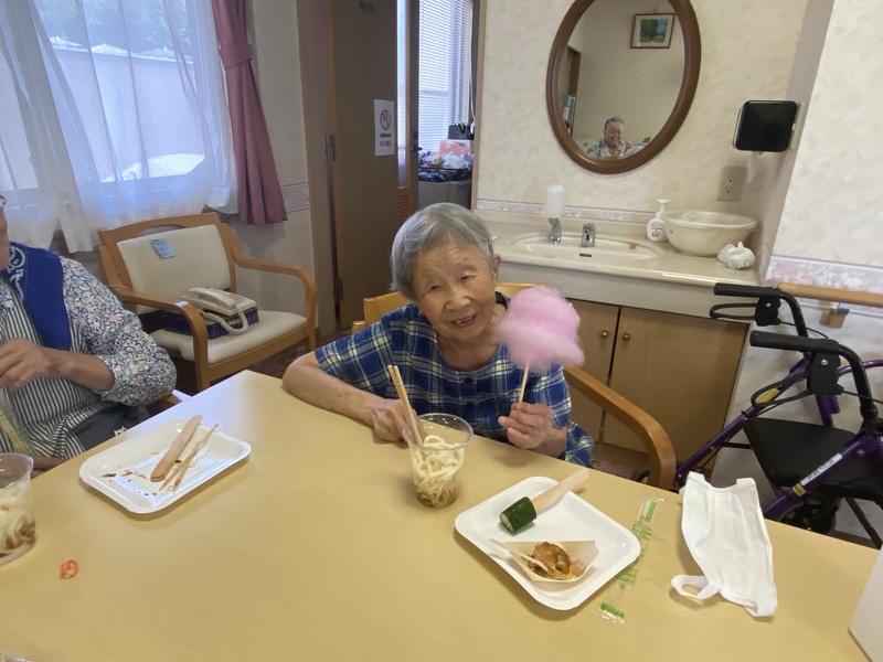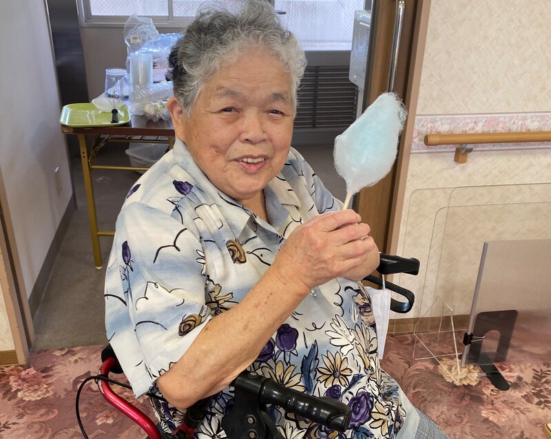 夏祭りを開催しました。実はこのお祭り、一年前に計画し、感染状況により中止となった待ちに待ったお祭りでした。綿菓子とかき氷を見つけて、「食べたい」「食べてみる」とおっしゃったのでお渡しすると、「実は人生で初めての綿菓子なんよ」と話が始まり、周りからも「私も」「私は80年ぶり!」などの声が聞こえてきました。昔からあったそうですが、その会話がとても楽しそうで、聞いている職員も笑顔になりました。皆さんの普段あまり見られないはしゃいだ姿がとても印象的な一日でした。
