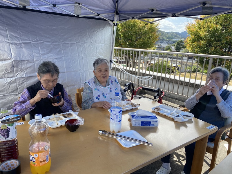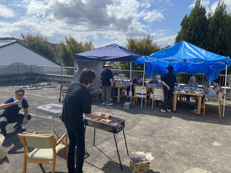 秋晴れのもと、ケアハウスベランダにてバーベキューをしました。
