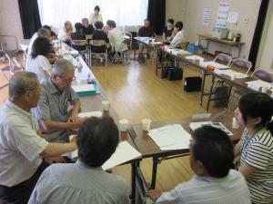 ただ今、台風接近中の蒸し暑いところをお集まりいただき「公会堂を集いの場所に活用するにはどうすれば良いか」いろいろな意見交換をいただきました。皆さんとても積極的に発言いただき今日も和やかな雰囲気のまま話し合いが進みました。皆さんの意見を聞いてみると、各地区の主体性を尊重しつつ、地域ごとの課題を整理していく必要があると感じました。