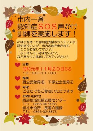 総社市内の各所で声掛け訓練を実施します。西部地区では、西公民館周辺・下原公会堂周辺を認知症高齢者役のボランティアと支援ボランティが周回します。10時~11時のわずかな時間ですが、ぜひお声掛けくださいますようお願いします。