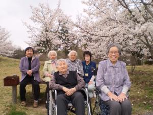 満開の桜の下で、記念撮影。みなさんとってもいい笑顔でしょう!桜の花びらを拾って家族に見せると持ち帰る方もいらっしゃいました。