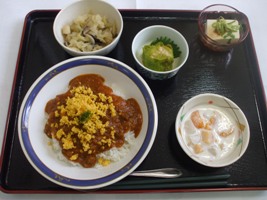 特養の入居者も軟飯やお粥、ペースト粥にドライカレーをトッピングし介護食で提供しています。