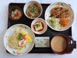 「ちらし寿司、やわらか豚カツ、切り干し大根と大豆の煮物、冷奴、フルーツ缶、にんじんのポタージュ」です。