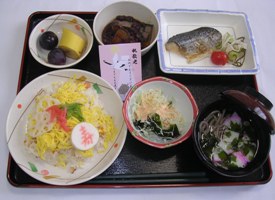 「ちらし寿司、鰆の山椒焼き、かぼちゃのいとこ煮、サラダ、フルーツ、和そばすまし汁」