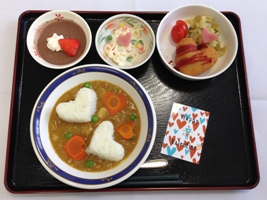 今日のバレンタインの昼食は『カレーライス、ハートのコロッケ、スパゲティサラダ、チョコレートババロア』でした。