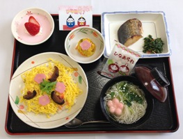 おひな祭りの行事食は『ちらし寿司、鰆の照焼、いちごのババロア、そうめんのすまし汁』を提供しました。