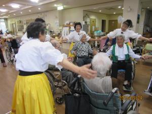 「三百六十五歩のマーチ」や「キヨシのズンドコ節」等皆さんご存知の歌に合わせて利用者さんと一緒にダンスを踊ってくださいました。