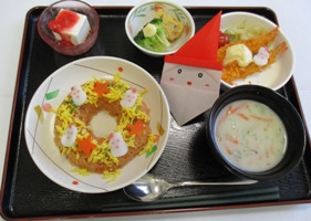 今日のお昼ご飯は『チキンライス、エビフライ、クリームスープ、ベイクドエッグ、レアチーズケーキ』でした。