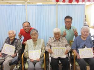 デイサービス最高齢の利用者様と敬老の節目の利用者様との記念撮影。