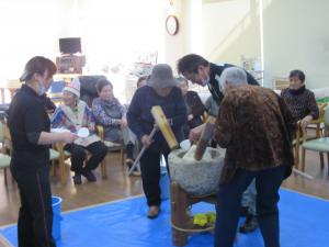 他の利用者からも、「引っ張るようにつかんと!」とか「はよう返し」など懐かしそうにかわるがわる餅つきをしました。