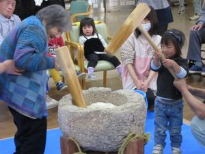 園児も「ヨイショ!、ヨイショ!」の掛け声に合わせ、お餅をつきました。