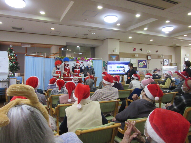今年最後の行事クリスマス会を行いました。職員によるハンドベル演奏や寸劇を披露すると、皆さん応援してくださったり、大笑いをされたりと終始楽しい時間を過ごすことができました。最後は美味しいおやつとサンタさんからのプレゼントを頂き喜んでいただけました。