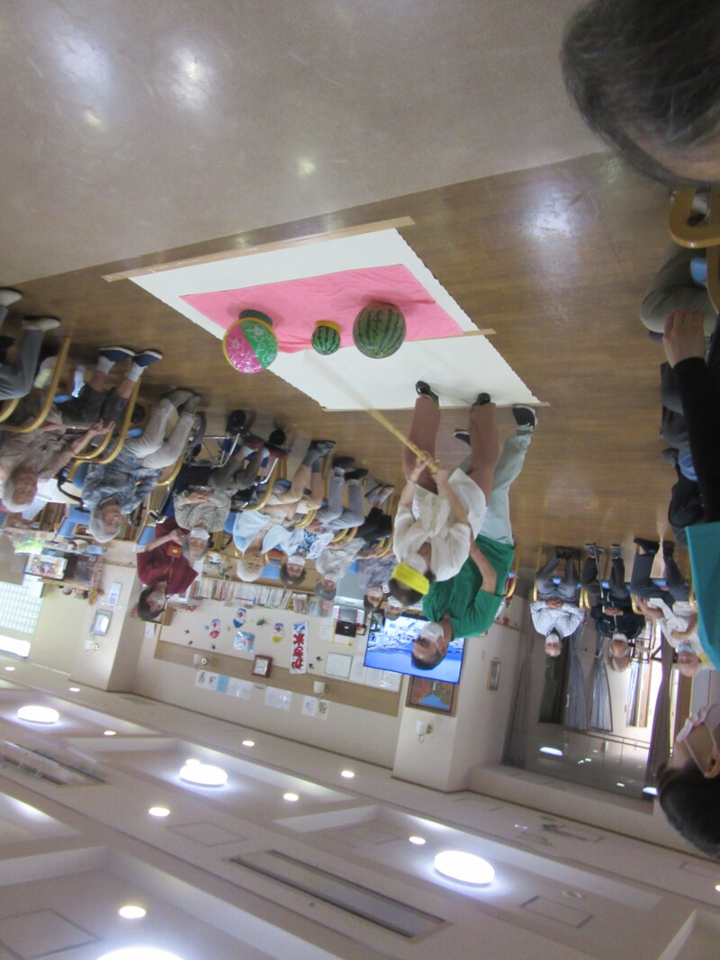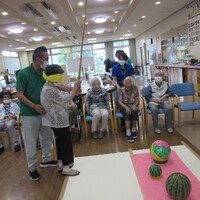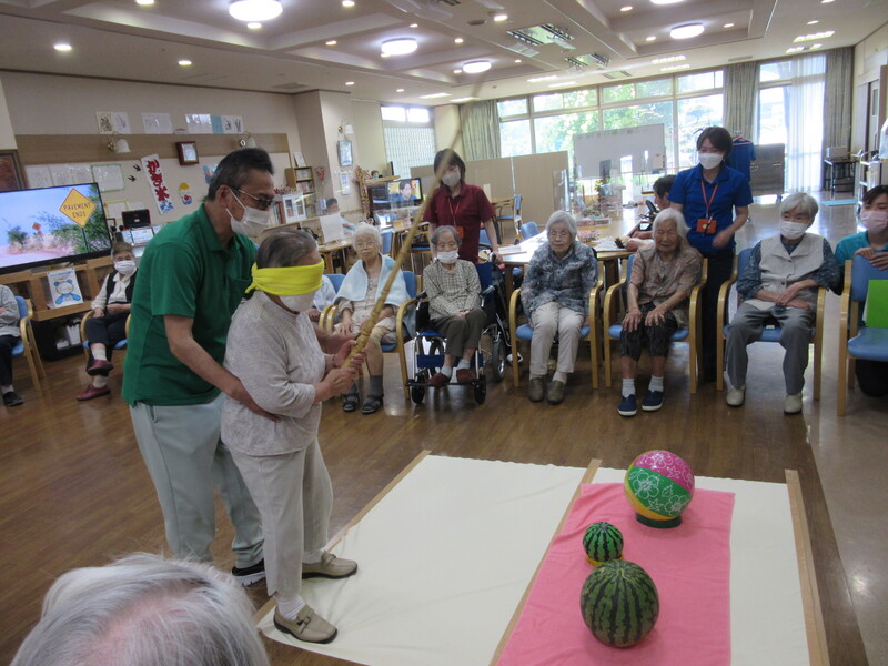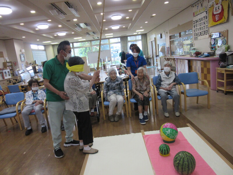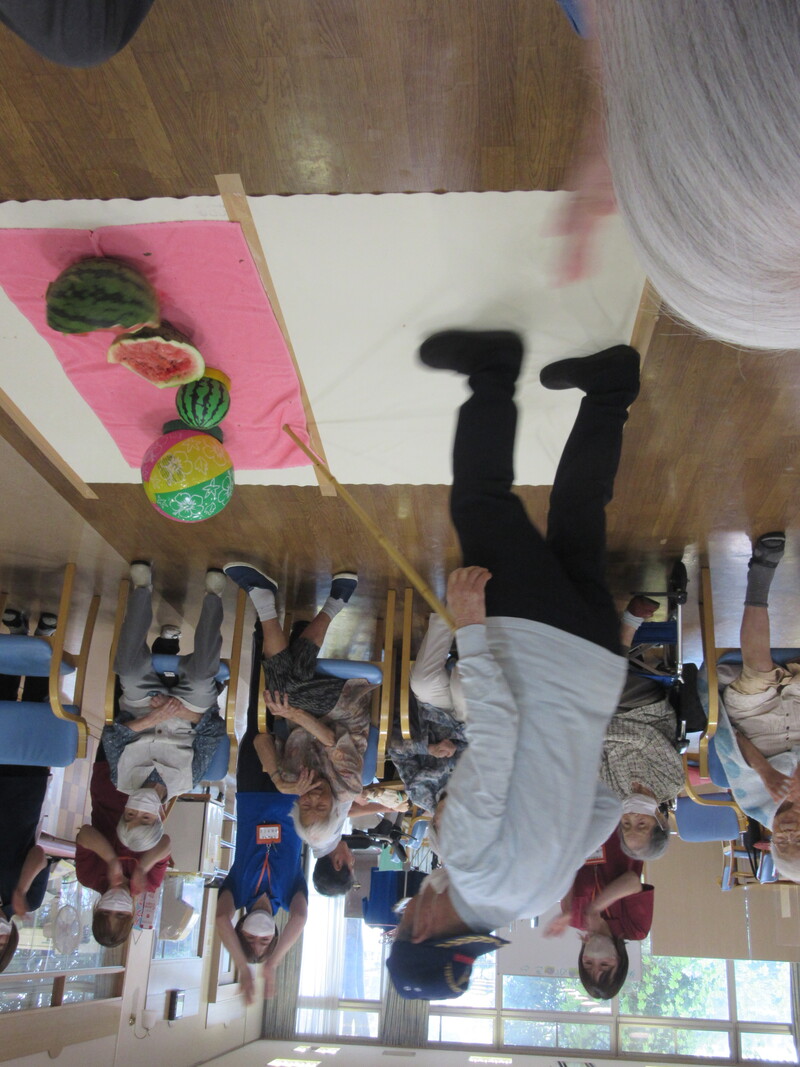 本日は皆様とスイカ割りを行いました。中々思うように割れなかったですが、スイカが割れたときは皆さん「やったー」と声を出し大喜びでした。スイカ割りを楽しんだ後のスイカは甘くてとてもおいしかったみたいです。