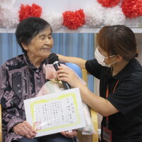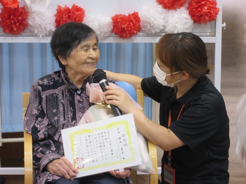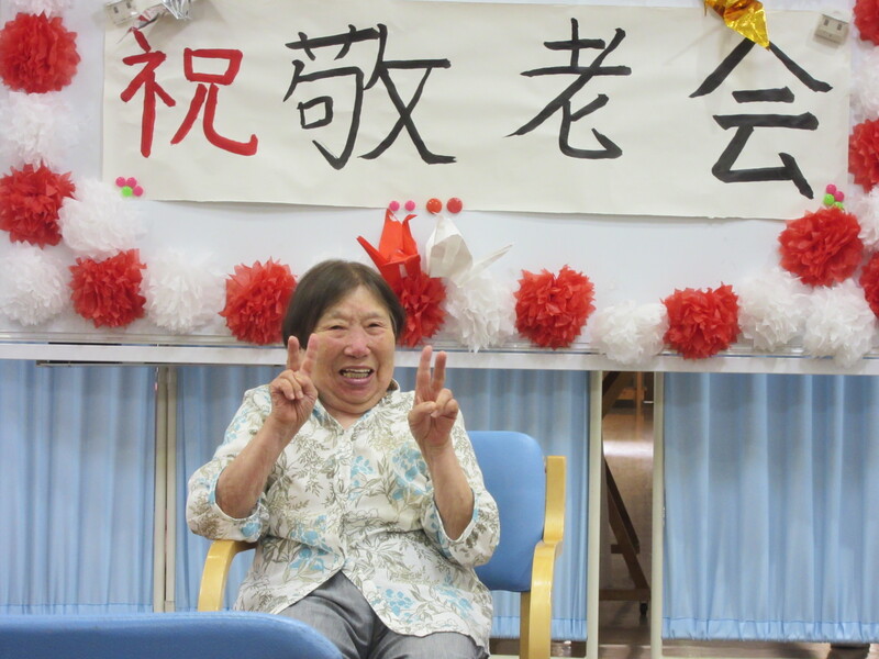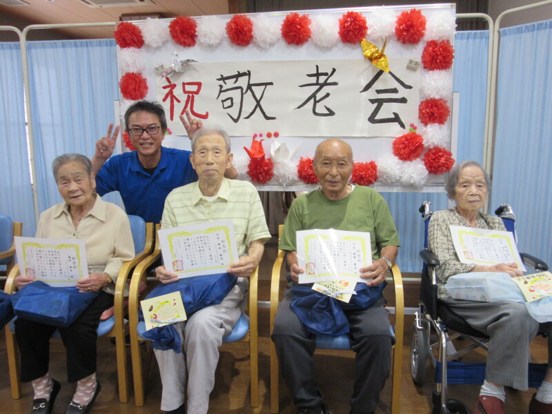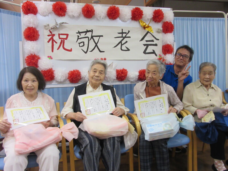 9月は4日間に渡って敬老会を実施しました。まず節目の方のお祝いを行いました。節目のお祝いのあとは、職員による出し物(寸劇)を披露しました。皆さん大笑いされたりと楽しんでいただくことができ終始大盛り上がりでした。