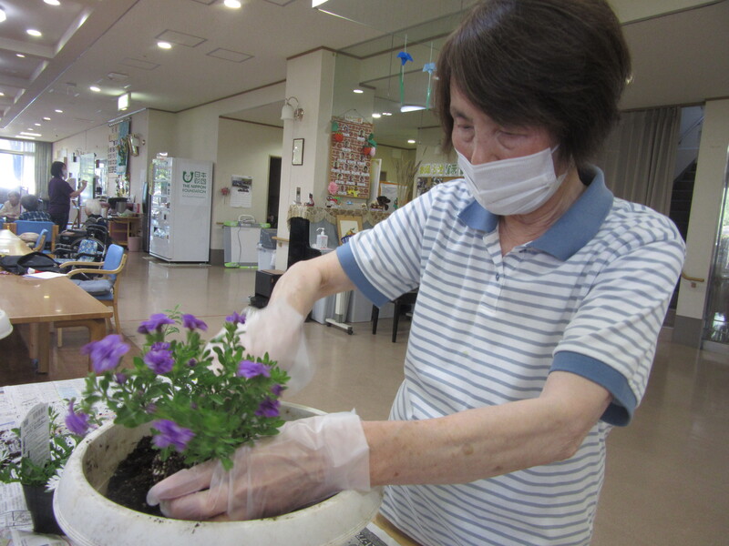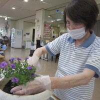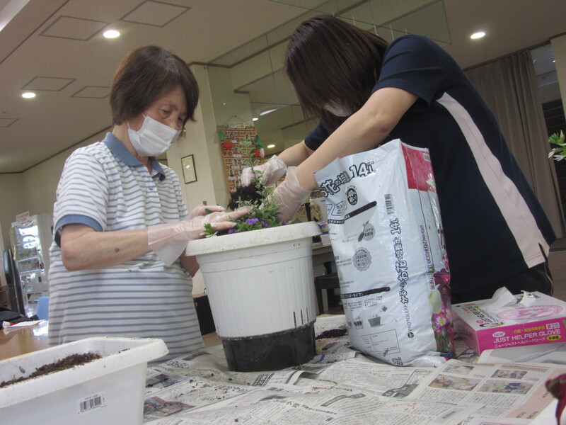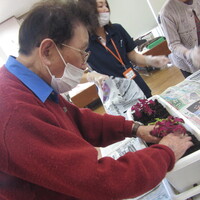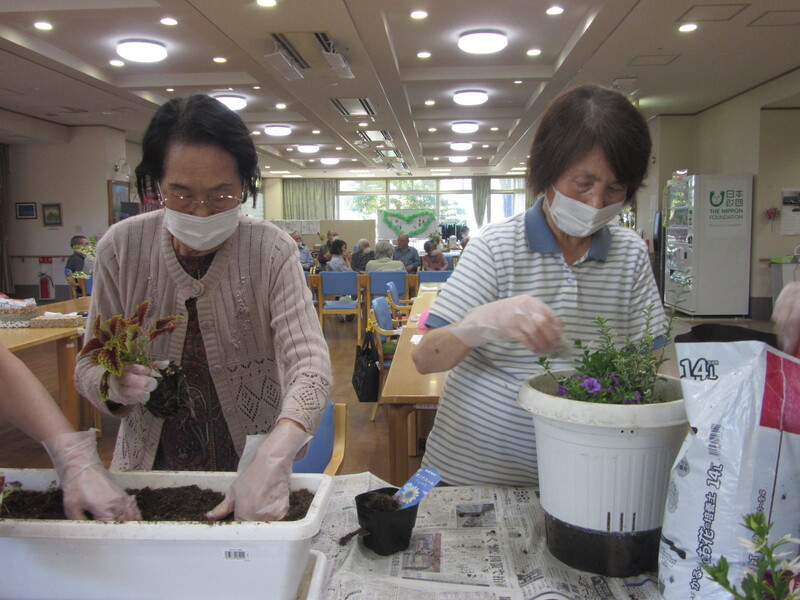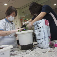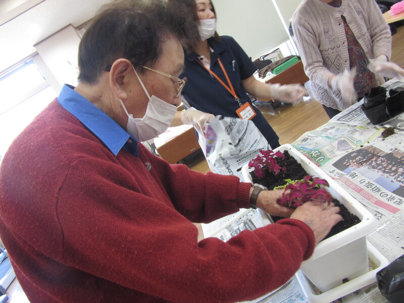 季節の花を皆さんと一緒に鉢植えしました。皆さんとても手際よく、バランスを考えられ綺麗に寄せ植えをされていました。花の成長が楽しみですね!