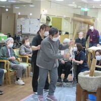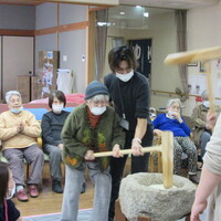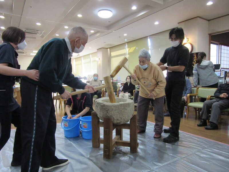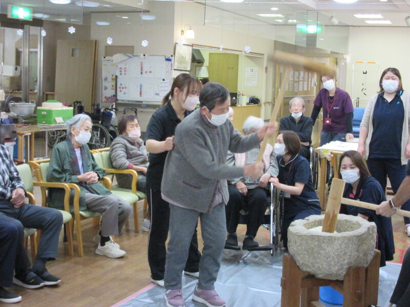 「懐かしいな」「昔はよくしてたんよ」と言われながら、男性利用者さんも女性の利用者さんも、皆さんの元気な掛け声とともに臼の餅をつかれていました。