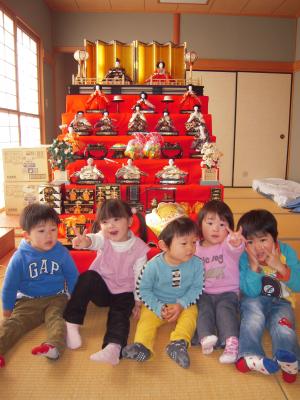 ひな祭りの絵本をみんなで見た後、ディサービスに飾ってあるひな人形を見に行きました。