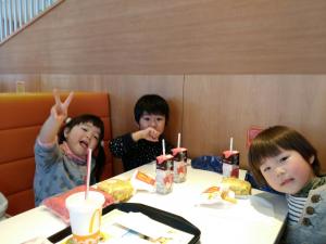 たくさん遊んだ後は、ハンバーガーとポテトを「おいしいねぇ」と言いながらお腹いっぱい食べました☆楽しかったね
