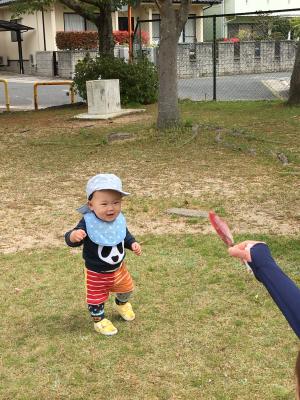 公園で葉っぱを見つけて、にっこり!