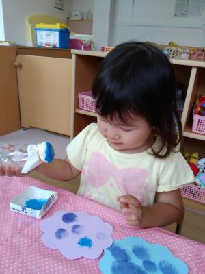 2歳児の子どもたちが絵の具をポンポンとして、あじさいのお花を作りました。保育園の入り口に飾っていますので、また見てくださいね