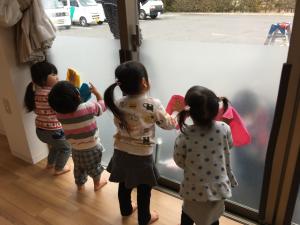 職員が窓拭きを始めると、子どもたちも一緒にお掃除!