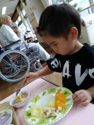 みかん・バナナ・パイナップルを真剣に飾り付けています。