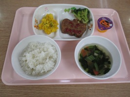 かぼちゃ型のハンバーグ、かぼちゃとおさつのスィートサラダ、コンソメスープ、ゼリー