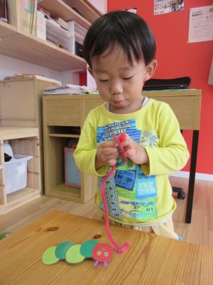1歳児のお友だちが、はらぺこあおむしのひも通しで遊んでいます。