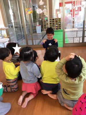 今日は子どもたちが前で、順番に手遊びをやっています!