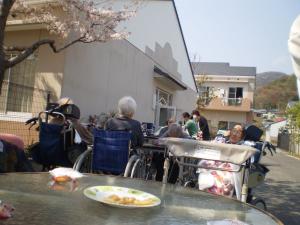 外でおやつを召し上がっていただき、日頃とは違った気分を味わいながら、春にしか見れない満開の桜を鑑賞していただきました。